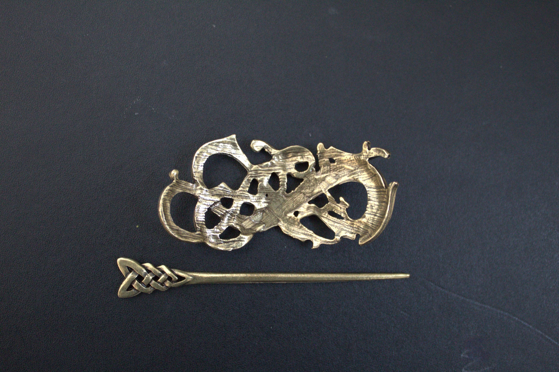This Irish Hair Barrette with antique bronze finish in the shape of a Gaelic or Celtic Knot, symbolizes the connection between two soulmates and their eternal bond. The closely intertwined lines represent the coming together of two people in unison thereby binding them forever in body, mind, and spirit. This Hair pin is accompanied by a stunning matching Knot weave Metal Stick pin to further accentuate the over-all appearance of your hair.