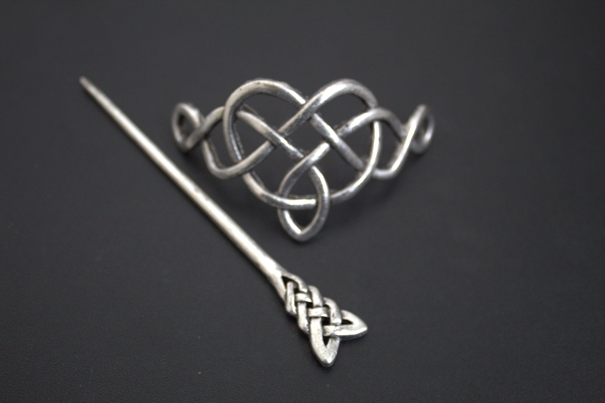 This Irish Hair Barrette with antique bronze finish in the shape of a Gaelic or Celtic Knot, symbolizes the connection between two soulmates and their eternal bond. The closely intertwined lines represent the coming together of two people in unison thereby binding them forever in body, mind, and spirit. This Hair pin is accompanied by a stunning matching Knot weave Metal Stick pin to further accentuate the over-all appearance of your hair.